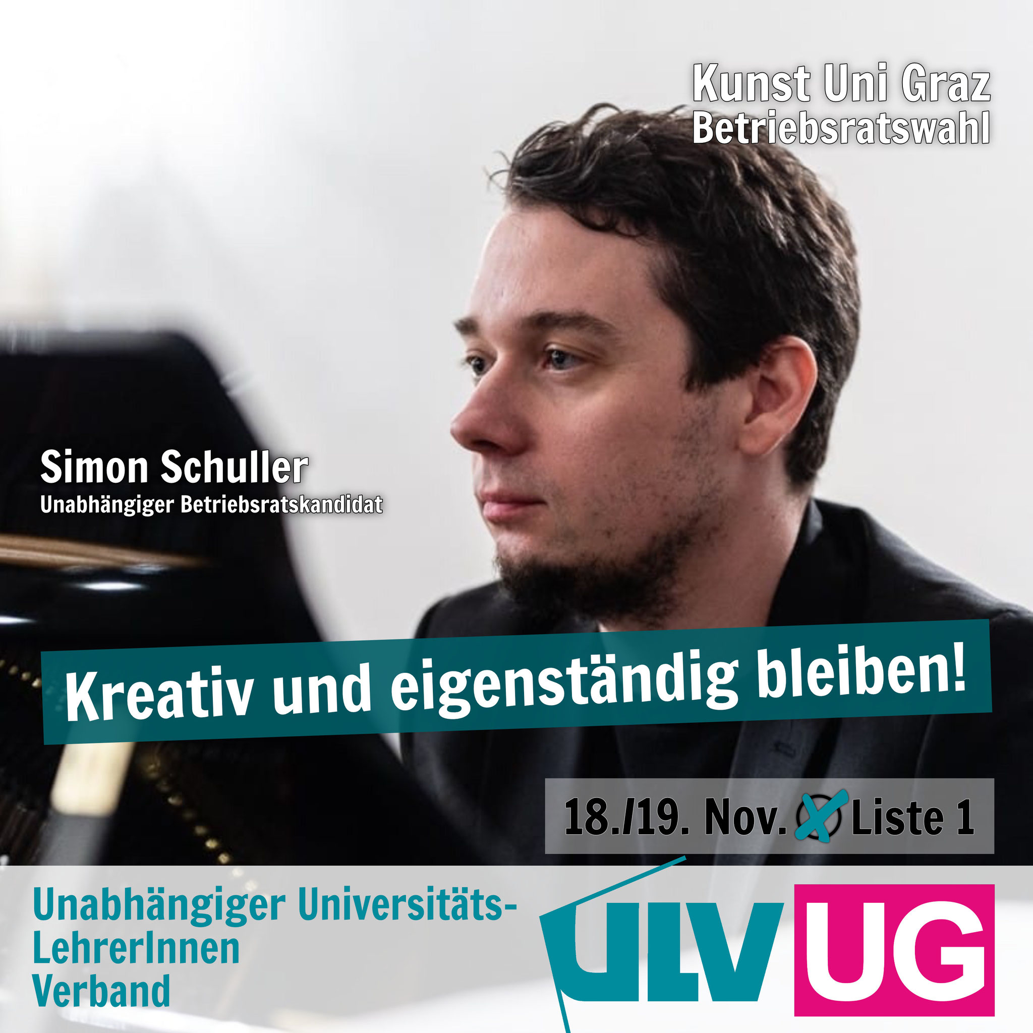 Als Mitglied des Betriebsrats der KUG möchte sich Simon Schuller besonders dafür einsetzen, dass auch in Zukunft der wesentliche Fokus und die Möglichkeiten, die Studierenden zu kreativen, eigenständigen Künstlerpersönlichkeiten ausbilden zu können, nicht verloren gehen. Außerdem soll auf den Leistungsdruck von Korrepetitor*innen ein besonderes Augenmerk gerichtet werden.