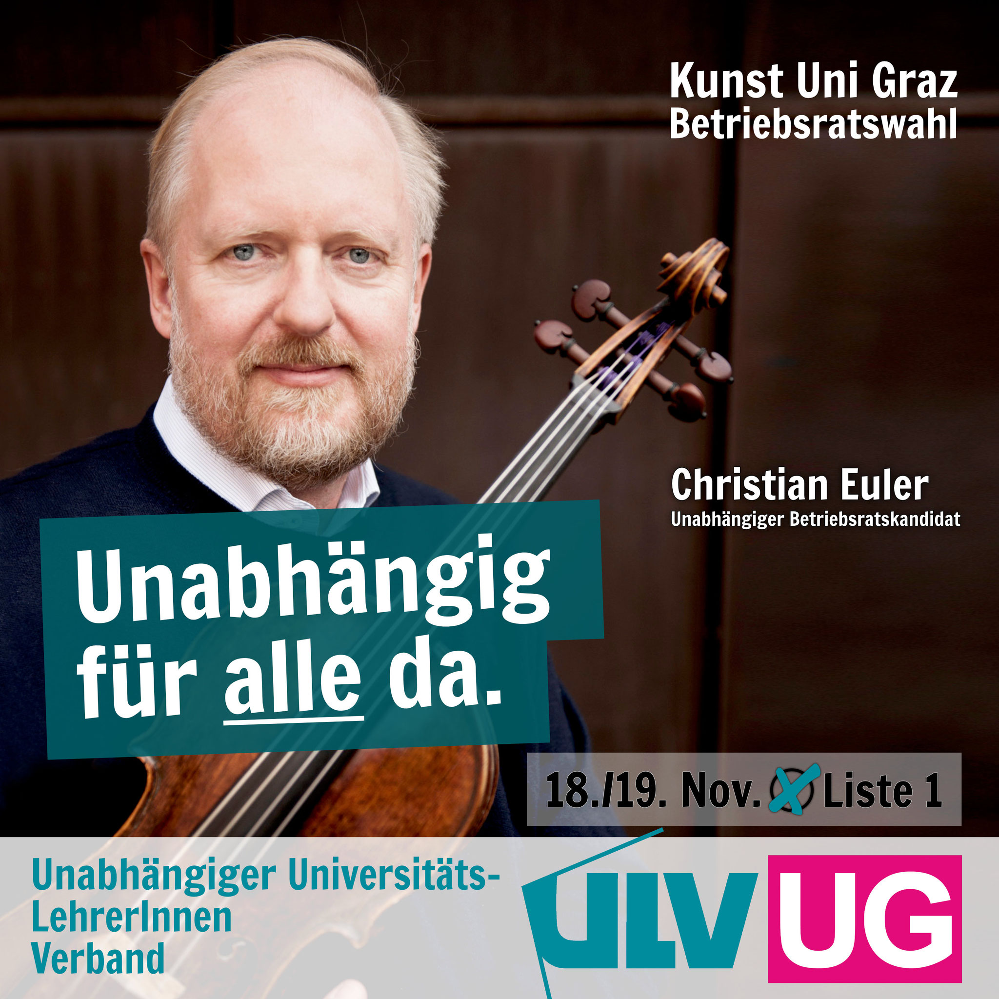 Unsere Betriebsratsliste ist mit dem Österreichischen UniversitätslehrerInnen-Verband (ULV) als Lokalverband an der Kunst Universität Graz eng verbunden. Der ULV ist die einzige parteipolitisch unabhängige Vereinigung, die alle Gruppen des wissenschaftlichen und künstlerischen Personals an allen österreichischen Universitäten vertritt.